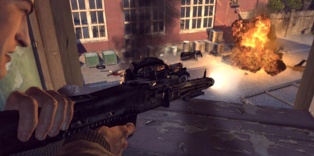 Era un viejo edificio donde planeábamos emboscar al enemigo, montamos las ametralladoras en las ventas y esperamos a que llegaran los autos. Apenas se estacionaron los tres autos negros, y yo comencé a depararles sin piedad, pero el objetivo logró escapar a un almacén que estaba al lado, salimos y de las primeras cosas que note es que mejoraron bastante el sistema de cover, algo que es vital en este juego, porque varias veces trate de salir “a la Rambo” y me mataron, además de que el uso de las armas se siente mucho mejor.