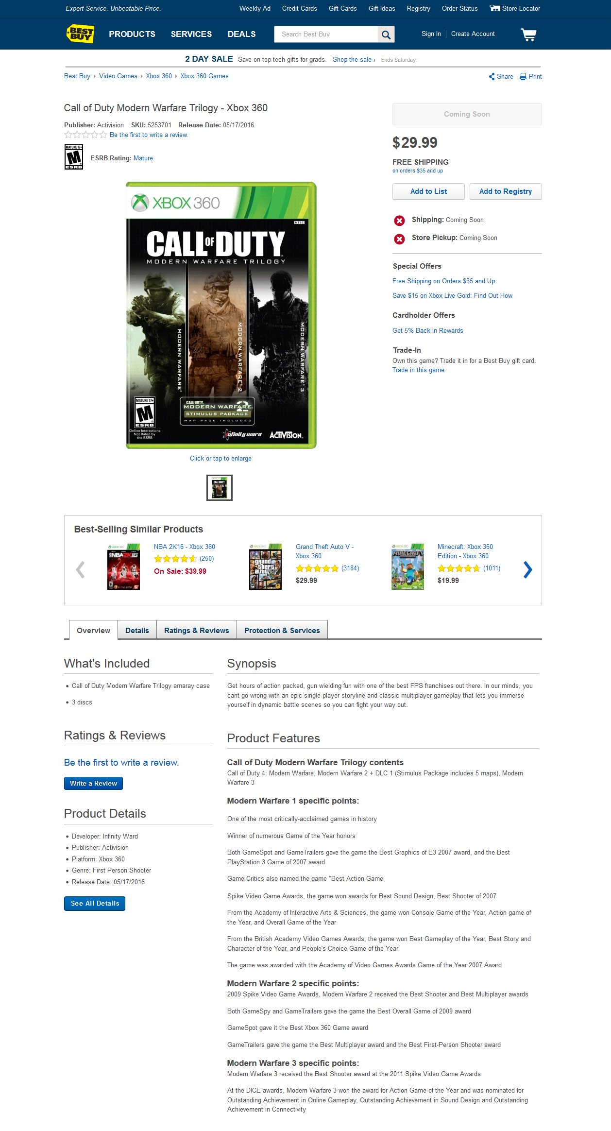 De acuerdo diversos reportes se ha dado a conocer que la cadena Best Buy enlistó dentro de su catálogo un nuevo compendio de juegos que comprende a la trilogía original de Call of Duty: Modern Warfare. Ésta estaría llegando el próximo 17 de mayo, contaría con un precio de $30 dólares y solamente se encontraría disponible para el PS3 y el Xbox 360.