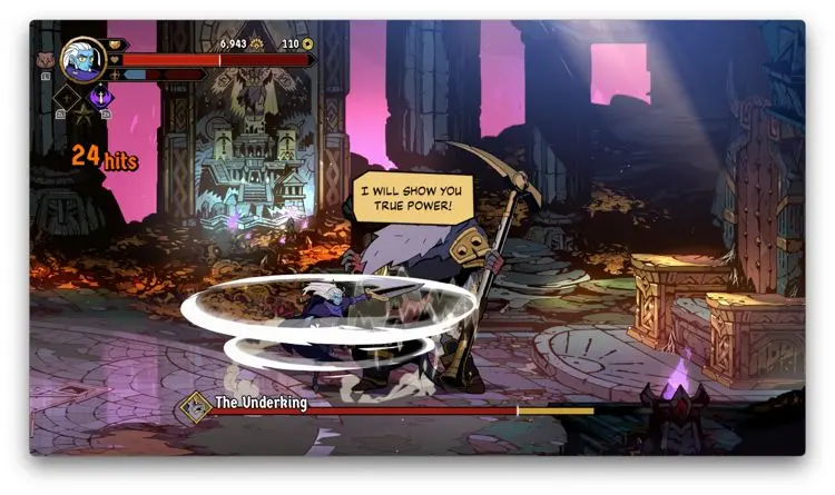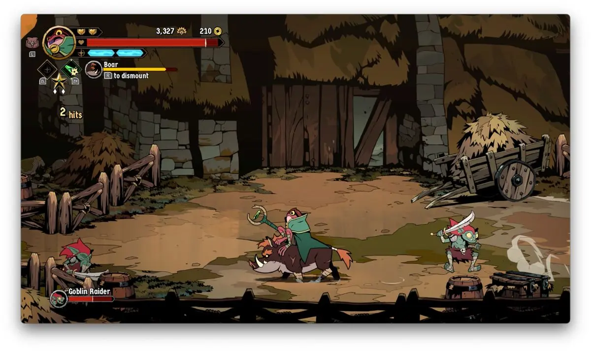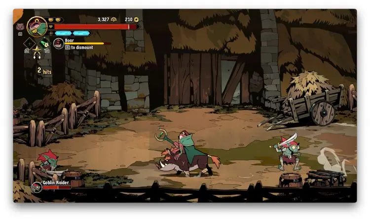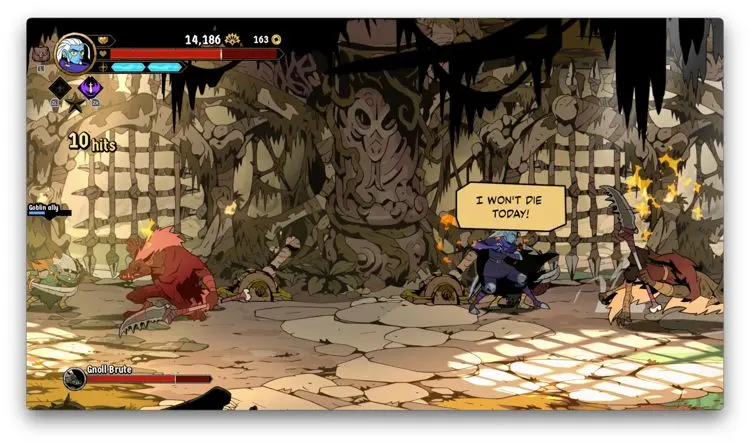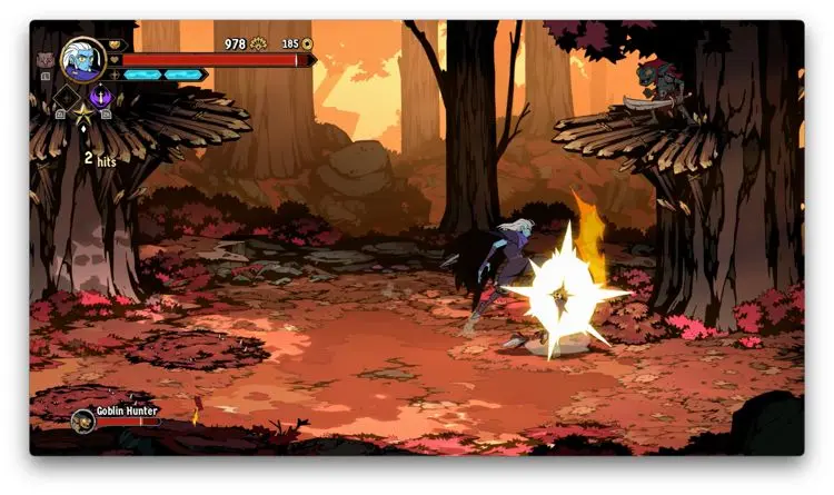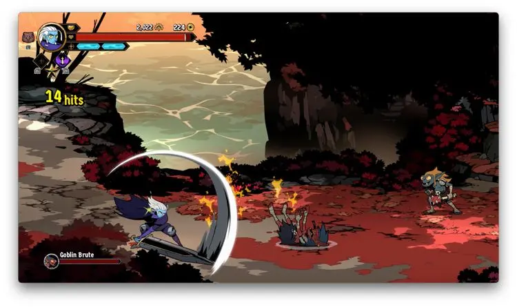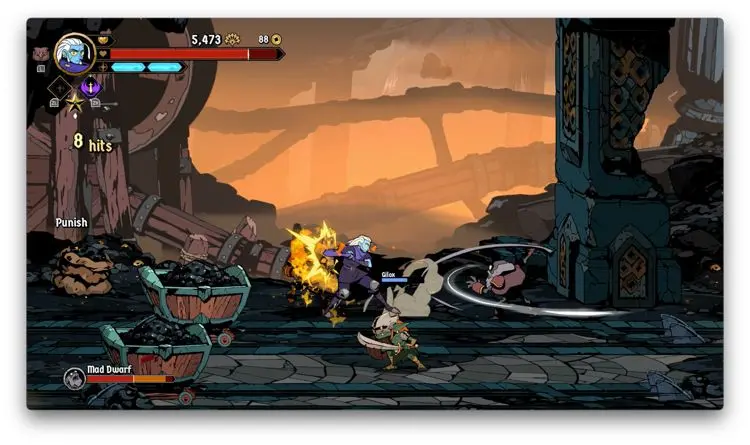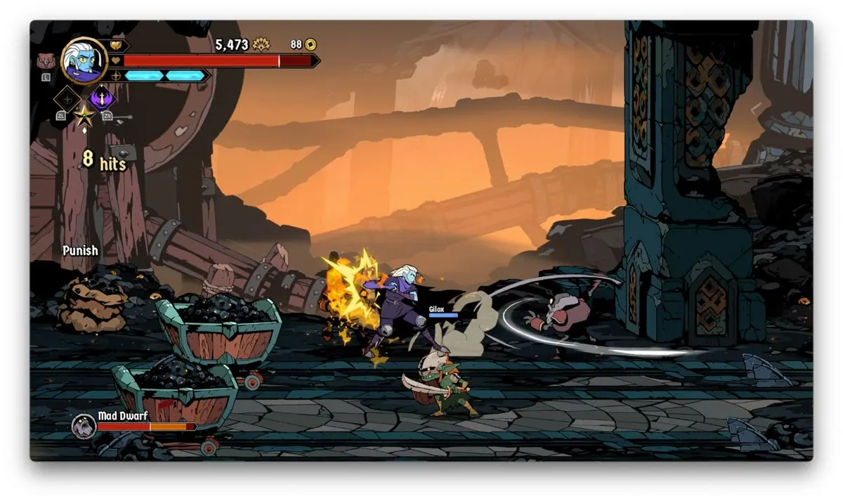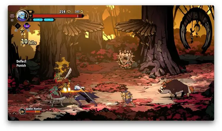 Hasta acá, podría parecer que al menos en temas de core gameplay, Absolum apuesta a la segura, y en cierta medida así es, no obstante, te das cuenta que el juego cobra muchísima más personalidad cuando entiendes y empiezas a usar sus mecánicas de defensa. Verás, al menos en la versión de Switch, usando el botón B, puedes hacer que tu personaje genere un dash ya sea hacía enfrente o hacía uno de los lados. Si haces dicho movimiento directamente enfrente de un enemigo mientras esté atacando, produces un bloqueo que si sigues con una agresión de tu parte, produce bastante daño. De igual forma, si cuando el enemigo en cuestión está por lanzar un golpe y haces un dash hacia arriba o hacia abajo y después contraatacas, también generas más daño. Por si esto no fuera poco, te cuento que en caso de que golpes justo al mismo tiempo que tu contrincante, se crea un choque que deja muy vulnerable al enemigo.