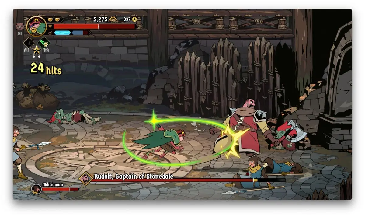 Eso no es todo, pues cada personaje también cuenta con una arcana que básicamente es su poder mágico, mismo que requiere de que una barra o barras estén llenas para poder ejecutarla. Por supuesto, esta habilidad debe de ser cuidada para usarse solo cuando hay necesidad. También es posible saltar para dar golpes aéreos, pero curiosamente es una opción que al menos en mi caso, casi no ha visto uso. El sentimiento de golpear enemigos en Absolum es igual o más placentero que en Streets of Rage 4. Es muy fácil detectar que es justamente el mismo estudio que estuvo detrás de ese espectacular beat 'em up de 2020.