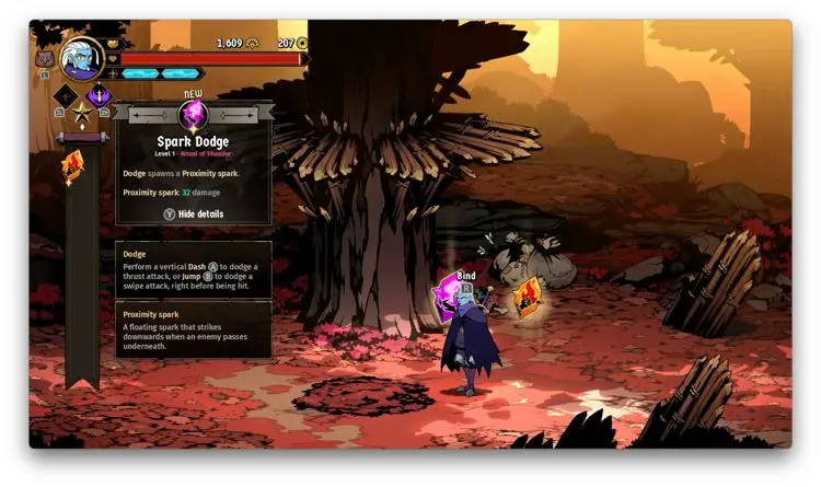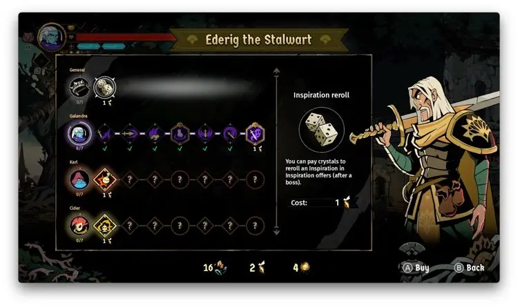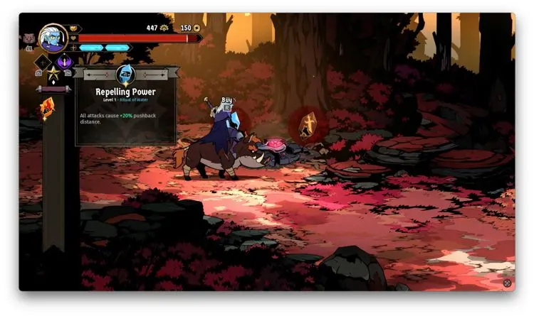 Las habilidades o poderes que obtengas en cada run y que se borran cuando mueres, están separadas en activas y pasivas. Por ejemplo, muchas pasivas te dan poderes elementales para por ejemplo, producir quemaduras con tus ataques regulares o encerrar a los enemigos en una burbuja de agua cuando los golpees con tu arma. Las activas, por su parte, permiten que Galandra haga un combo de tres golpes con su espada, por ejemplo. Cada que superas una sección o cuarto, se te suele recompensar con lo que Absolum llama rituales, normalmente tendrás que elegir entre dos de ellos para seguir adelante.