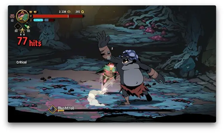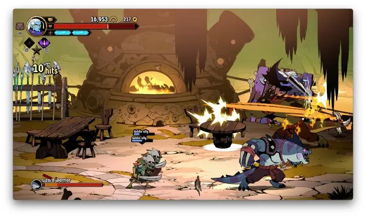 Dicho lo anterior, te cuento que sin importar al personaje que elijas, su principal ataque son golpes melee directos con sus extremidades, solo Brome ocupa su bastón y su lengua para agredir, pero lo que te quiero decir con esto es que Absolum es un brawler en toda la extensión del término. Además de dichos ataques base, tenemos el uso de un arma. Por ejemplo, Galandra puede coronar un combo de golpes con un espadazo, Erik lanza un devastador disparo con su arma de fuego, y Cider tiene una especie de gancho para jalar enemigos. La rana, siendo la más distinta, genera una bola de energía que golpea en dos direcciones. Nuestro trabajo es mezclar estas dos formas de ataque para generar los combos más largos que podamos.