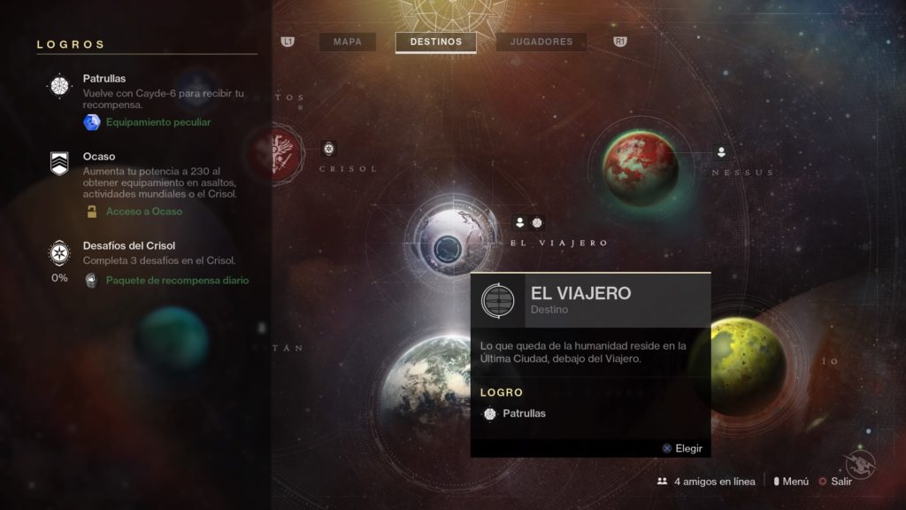 Serás recibido con una nostálgica introducción de tus hazañas del primer juego. Son ilustraciones de cuando acabaste la campaña, tu primer Nightfall, Strike, Raid y del contenido de las diferentes expansiones. Aparte de la fecha en la que transcurrió cada uno de esos logros, también se te recordará con cuál de tus amigos lo hiciste. Es una buena forma de recordar dichos momentos como un repaso, de acordarte de compañeros que quizá no has visto en mucho tiempo e incluso como un brevísimo repaso de la historia.