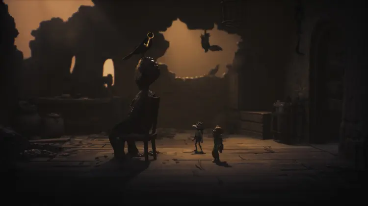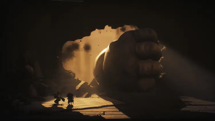 Regresando un poco a todo el tema del core gameplay de Little Nightmares III, tenemos que las herramientas fijas pueden abrir algunas posibilidades interesantes, pero tampoco te diría que cambian demasiado las cosas. Hay algunas secciones de combate más interesantes en las que por ejemplo, Low debe usar su arco para tirarle la cabeza a las marionetas que nos agreden, y Alone las tiene que destruir con su llave. Es un ejercicio de coordinación bastante divertido que indudablemente ayuda a que la experiencia tenga mejor ritmo. Igualmente hay secciones en las que te dan un ítem temporal como una flor para volar en corrientes de aire, o una linterna para alumbrarte el camino.