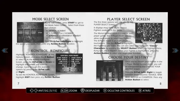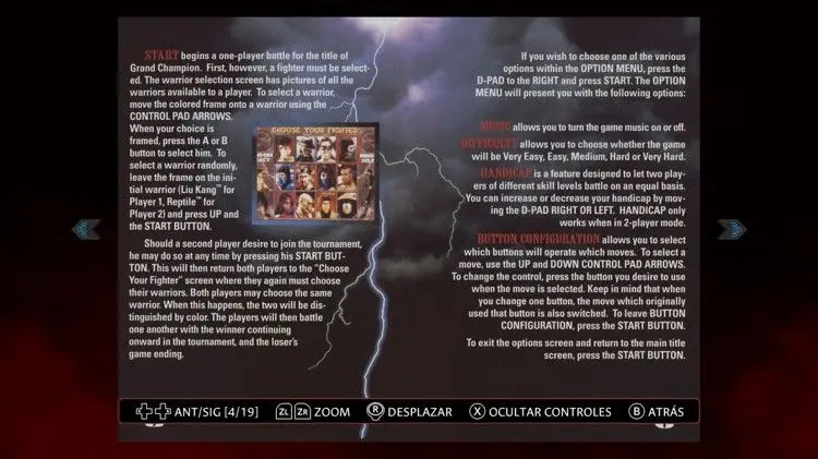 Al presionar pausa también podemos acceder al menú de controles y así conocer los diferentes inputs para el control, ya sea desde la patada débil o fuerte hasta los puñetazos. A eso le podemos agregar que, si el jugador se ve opacado por lo difícil que pueden tornarse estos juegos, se puede seleccionar el nivel de reto para que este pueda llegar al final del arcade o modo historia de los clásicos.