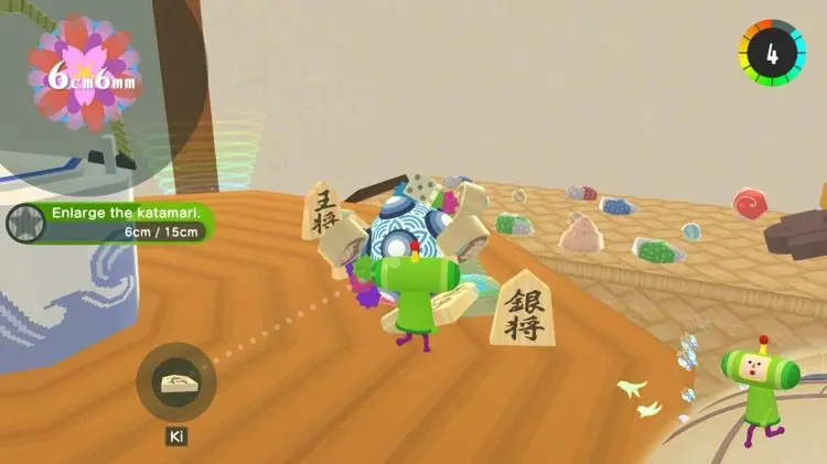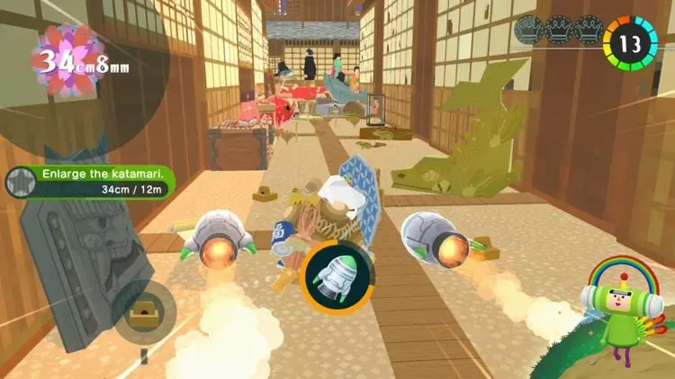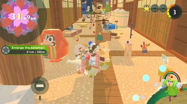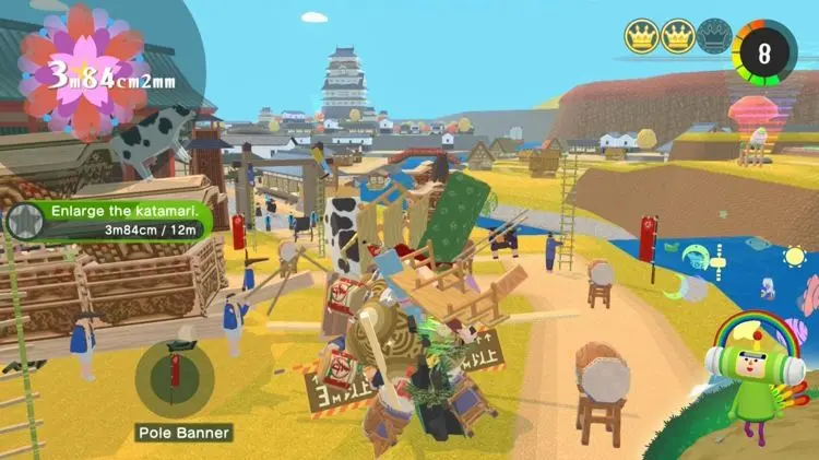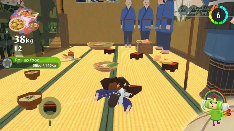 Por ejemplo, un nivel nos pide darle de comer a un hombre para hacerlo crecer y que porte una armadura pesada. Esto lo vimos en We Love Katamari con un sumo, pero Once Upon a Katamari logra diferenciarse al ofrecernos un diseño de niveles enfocado en la exploración vertical. Este escenario se desarrolla en un castillo japonés, en donde tenemos que recorrer varios pisos para obtener la cantidad necesaria de alimentos. Aunque se puede llegar a sentir que todas las tareas ya las experimentaste, hay una capa de pintura lo suficientemente nueva para evitar un fuerte sentimiento de repetición.