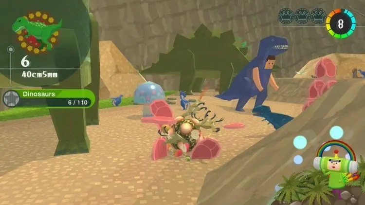 A la par, regresan los primos. Junto a El Rey de Todo el Cosmos, La Reina de Todo el Cosmos y El Príncipe, la familia real también hace acto de presencia, y siempre es divertido ver cómo es que estos personajes secundarios lucen. Si bien algunos continúan los conceptos de los protagonistas, otros más parecen que fueron creados al moldear plastilina sin alguna dirección clara. Parte de esto se debe a que necesitan resaltar de los cargados escenarios que recorremos. Son más fácil destacar entre la comida, plantas, humanos y animales cuando sus diseños se reducen a tres bolas moradas pegadas con un par de pequeñas extremidades.