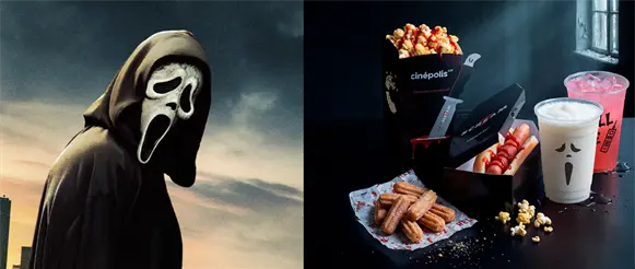El filme retoma la historia con la hija de Sidney Prescott como nuevo objetivo del enmascarado, además del regreso de figuras clave del elenco como Neve Campbell, Courteney Cox y Matthew Lillard. Para reforzar el evento, la cadena de cines permitirá comprar el menú especial desde el 10 de febrero de 2026 mediante su aplicación y página web, localizándolo con el título de la película.